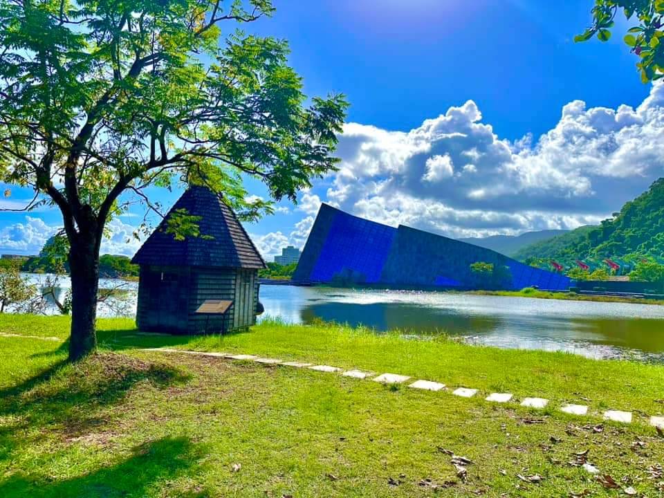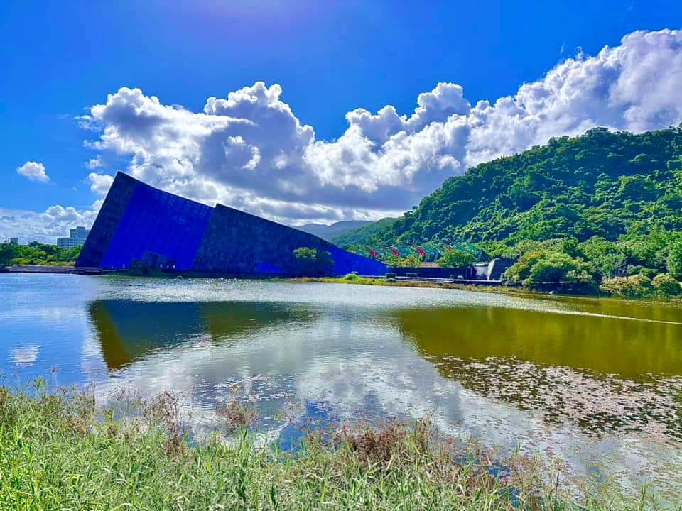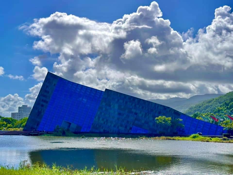 蘭陽博物館主建物最高頂點朝向宜蘭精神地標的龜山島,沿著西南方逐漸隱沒在地面,整座建物就像一隻可愛的大鯨魚在休息,超級療癒!除了建築本體外,外牆也別有用心,具館方所說是由音符轉化而來,透過石材及鑄鋁板呈現蘭陽大地的農田景觀,配上大片的玻璃反射,藍天白雲景致就像一幅幅名畫印在牆上,讓人忍不住拍到不願意離開!
